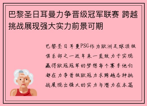 巴黎圣日耳曼力争晋级冠军联赛 跨越挑战展现强大实力前景可期
